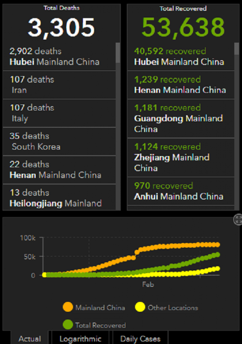 الصين: 80430 إصابة، 160 منها جديدة، 3013 حالة وفاة، منها 32 حالة جديدة، وأبلغ عن تعافي 52259 حالة، أما هونغ كونغ، 105 حالة، 2 حالة جديدة، 2 حالة وفاة دون وفيات جديدة، تايوان 44 حالة، 2 حالة جديدة، 1 حالة وفاة دون وفيات جديدة، وماكاو 10 حالة، لا حالات جديدة، صفر وفيات.