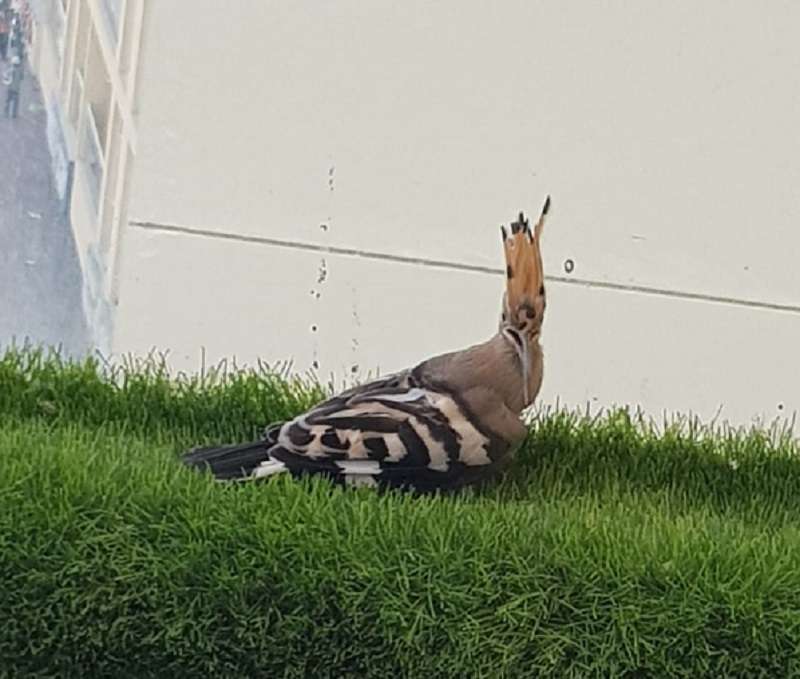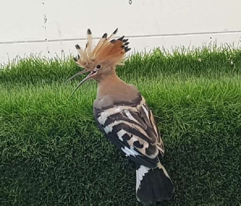 Al Rashdan pointed out that "the weather was very hot, and the bird seemed to open its mouth, and it seemed exhausted from the heat, it remained on the balcony from morning until sunset, and we intended to take it to a veterinarian, but he ate the food and drank some water we provided, and we took photos and a video for this unexpected visitor, and after that the Hoopoe summoned his strength and flew away”.