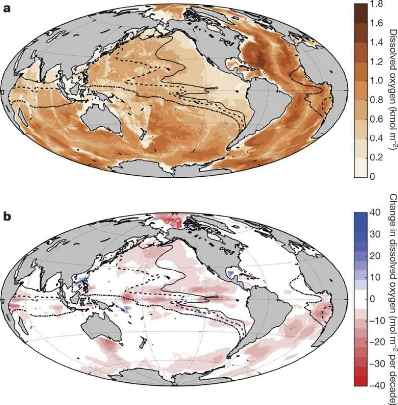 في العقد الماضي، أخذت مستويات الأكسجين في المحيطات تنخفض بوتيرة متسارعة، وهو اتجاه ينذر بالخطر ويرتبط بتغير المناخ، وذلك وفقا لـ أندرياس أوشليس Andreas Oschlies، وهو متخصص في علم المحيطات في مركز هيلمهولتز لبحوث المحيطات Helmholtz Centre for Ocean Research في ألمانيا، والذي تتبع مع فريقه العلمي مستويات الأوكسجين في كافة أنحاء العالم، وقال: "لقد فوجئنا بشدة بالتغيرات التي رأيناها، ومدى سرعة انخفاض مستويات الأوكسجين في المحيطات، ومدى تأثير هذا الأمر على النظم البيئية البحرية".