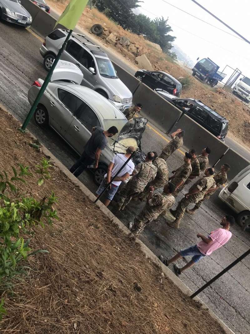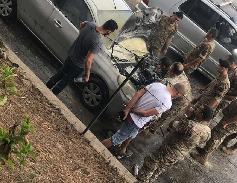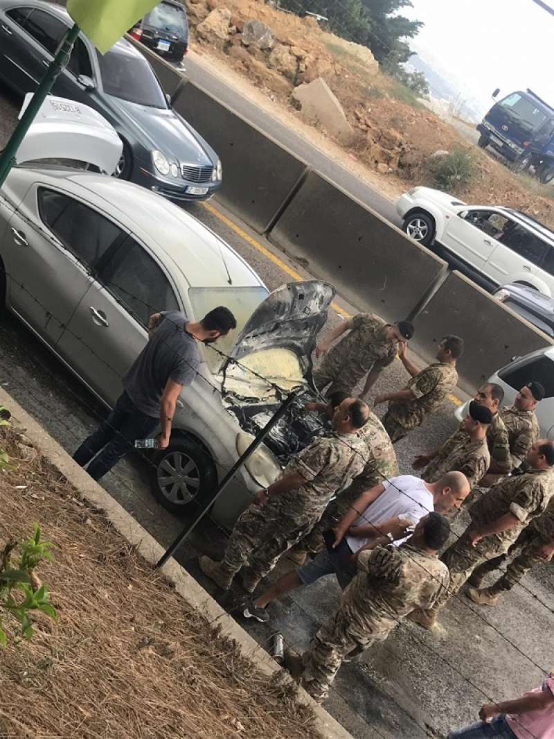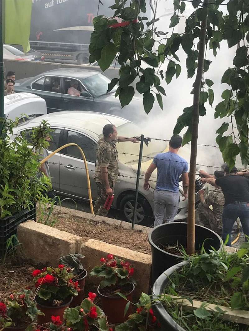 أفراد من الجيش اللبناني يطفئون النيران في سيارة أحد المواطنين!
