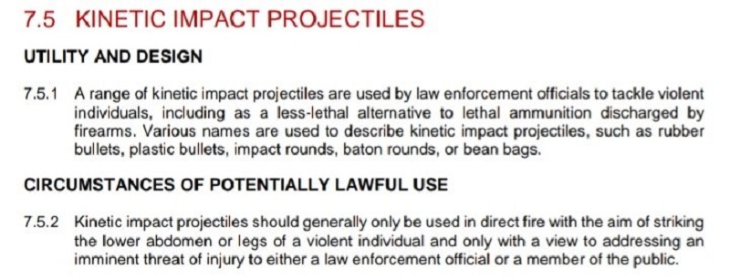 وكتب آخر: "حسب الإتفاقيات الدولية ولجنة حقوق الإنسان ١- يُمنع إطلاق الرصاص المطّاطي على مسافة أقل من ٤٠ متر ٢- يُمنع إطلاق الرصاص المطّاطي على غير الأرجل ٣- يُمنع إطلاق الرصاص المطّاطي في الليل في الصورة: إطلاق الرصاص المطّاطي في الليل على بُعد أقل من خمسة أمتار وتصويب على الرأس".